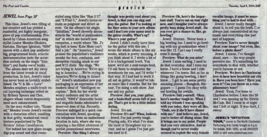 As a contributor to The Post and Courier, South Carolina's largest newspaper, I profiled dozens of popular musicians, including Gregg Allman, Bob Weir, The Strokes and, in this case, Jewel. We spoke via phone as Jewel prepared to embark on a tour promoting her album 0304.